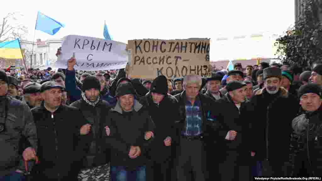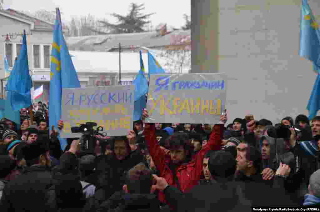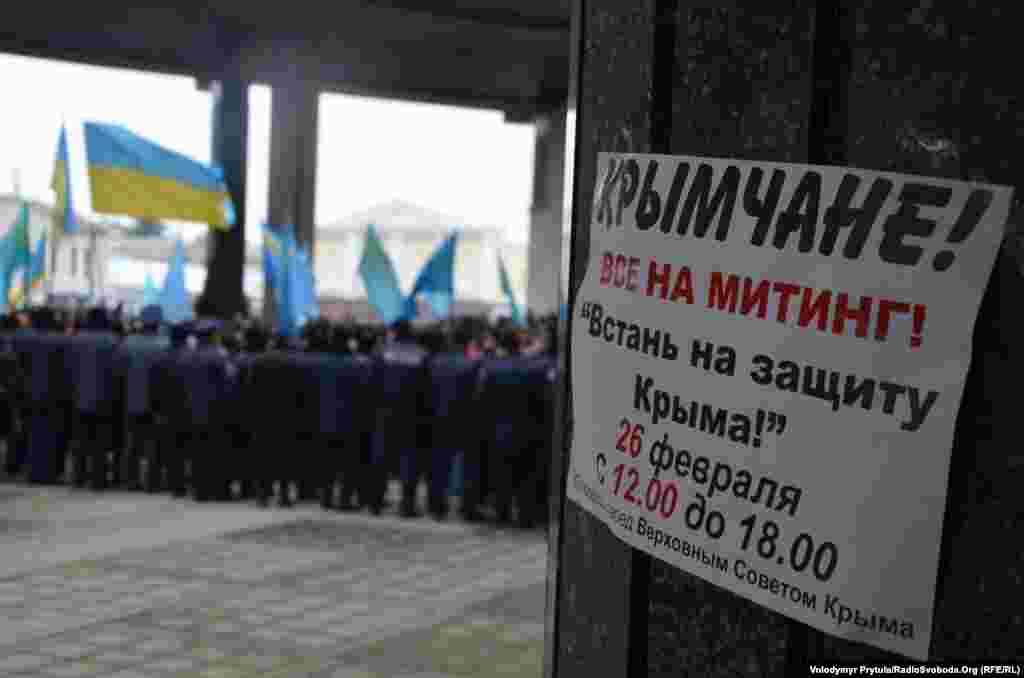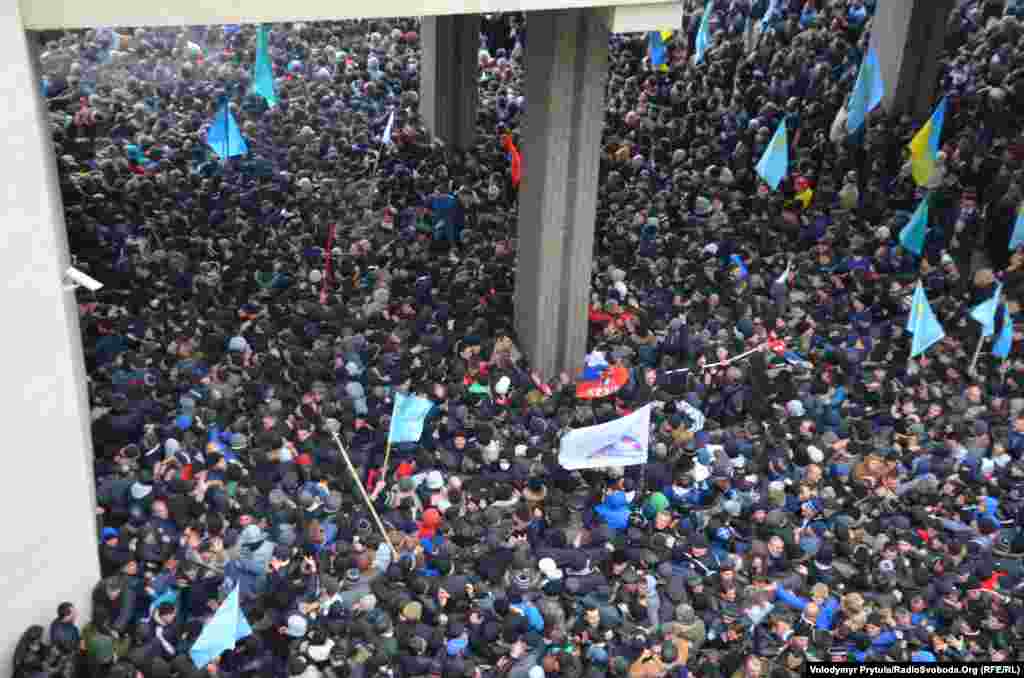 Під стінами кримського парламенту в Сімферополі 26 лютого пройшли мітинги за і проти збереження територіальної цілісності України. Понад 10 тисяч кримських татар і кримчан інших національностей прийшли виступити проти можливих сепаратистських рішень Верховної Ради Криму. Їм протистояло до 5 тисяч активістів проросійських організацій. Після тривалої штовханини і низки дрібних зіткнень сепаратистів відігнали від кримського парламенту.
