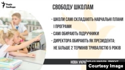 «Ця школа буде дружньою до дитини. Буде можливість обирати, чим ти хочеш займатися. Звісно, буде певне ядро знань. Буде можливість обирати собі проекти спрямування. Особливо це стосується старшої школи, коли ти зможеш визначитися, що для тебе ближче. Головне в цій школі – навчити дитину вчитися протягом усього життя. Бо школа зараз не є єдиним місцем, де є знання, як це було у минулі століття», – зазначила Радіо Свобода голова громадського об’єднання «Батьківський контроль», радник міністра освіти Оксана Макаренко.