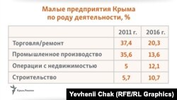 У 2016 році господарські пріоритети кримчан змінилися. Зокрема, частка торгівлі/ремонту скоротилася до 20,3%, промисловості ‒ до 13,6%. При цьому зросла кількість малих підприємств у сфері операцій із нерухомістю ‒ з 5 до 12,1%, будівництві ‒ з 5,7 до 10,7%.