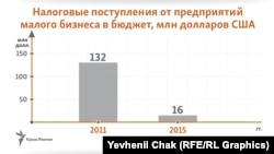 А це означає скорочення «податкових» надходжень до «бюджету». Наприклад, в 2015 році кримський малий бізнес виплатив «доходів» на суму трохи більше ніж 1 мільярд рублів (близько 16 мільйонів доларів США). У той же час в 2011 році сума доходів, принесених малим бізнесом у Криму, склала 1,06 мільярда гривень (приблизно 132 мільйони доларів США) або майже 17% від усієї суми податків і зборів. Іншими словами, в 2015 році розмір «податкових» надходжень від малого бізнесу в окупованому Криму, порівняно з 2011 роком, скоротився у 8 разів.