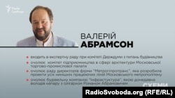 Абрамсон – почесний будівельник Росії, бізнесмен, тісно інтегрований у російські структури, в тому числі навколодержавні. Входить до експертної ради при комітеті Держдуми з питань будівництва, очолює комітет підприємництва у сфері архітектури московської торгово-промислової палати, а також раду директорів фірми «Метрогіпротранс», яка розробила проекти усіх нинішніх працюючих ліній Московського метрополітену.