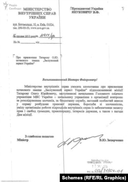 Заступник керівника Офісу президента Олег Татаров у розпал Революції гідності отримав звання «Заслужений юрист України» від Віктора Януковича за особистим поданням тодішнього міністра внутрішніх справ Віталія Захарченка – «за впровадження в життя рішень президента, Верховної Ради та Кабінету Міністрів, спрямовуючи зусилля підлеглих працівників на посилення боротьби зі злочинністю та зміцнення правопорядку в державі». На момент нагородження Татаров обіймав посаду заступника керівника Головного слідчого управління МВС і регулярно публічно коментував події на Майдані, розповсюджуючи звинувачення на адресу активістів. Про це повідомляють журналісти програми «Схеми», які отримали ці документи у своє розпорядження.