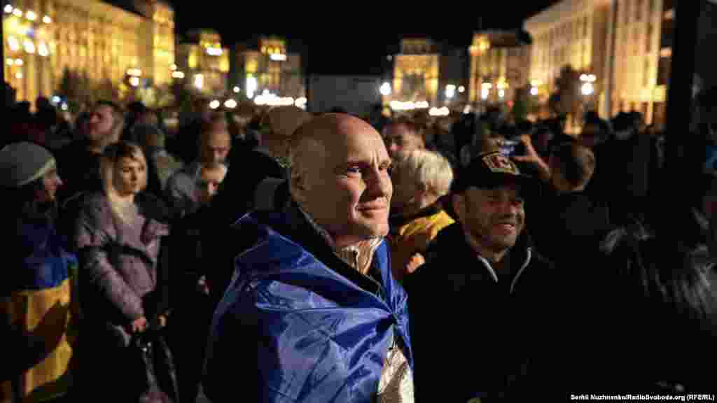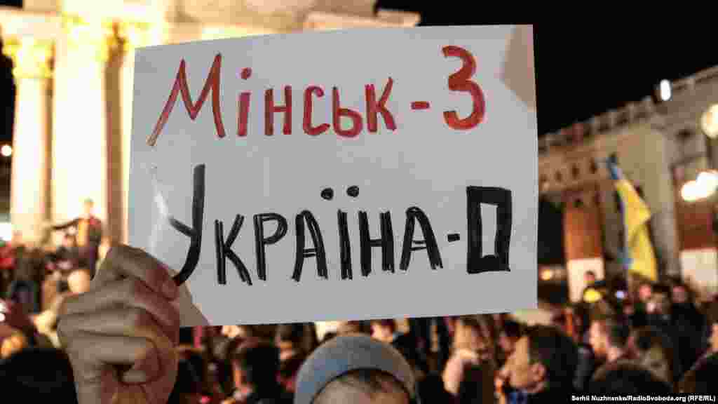 У той самий час на майдані Незалежності зібралося декілька сотень активістів, які з такими ж гаслами виступали проти ймовірних виборів в ОРДЛО, розведення сил та засобів і «капітуляції».