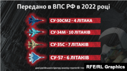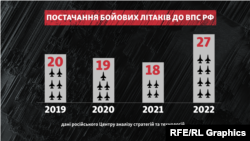 Ось статистика російського Центру аналізу стратегій та технологій – це єдині дані із відкритих джерел. За перший рік повномасштабної війни проти України Росія, за даними Центру, поставила на крило 27 фронтових бортів (літаків тактичної авіації).