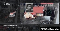 Радіо Свобода отримало в розпорядження фото із дрону, на якому зафіксовано, як група російських військових проводить так звану зачистку на приватному подвір’ї у Бучі, а поруч них лежить розстріляний господар цього будинку ‒ 69-річний Валерій Кізілов.