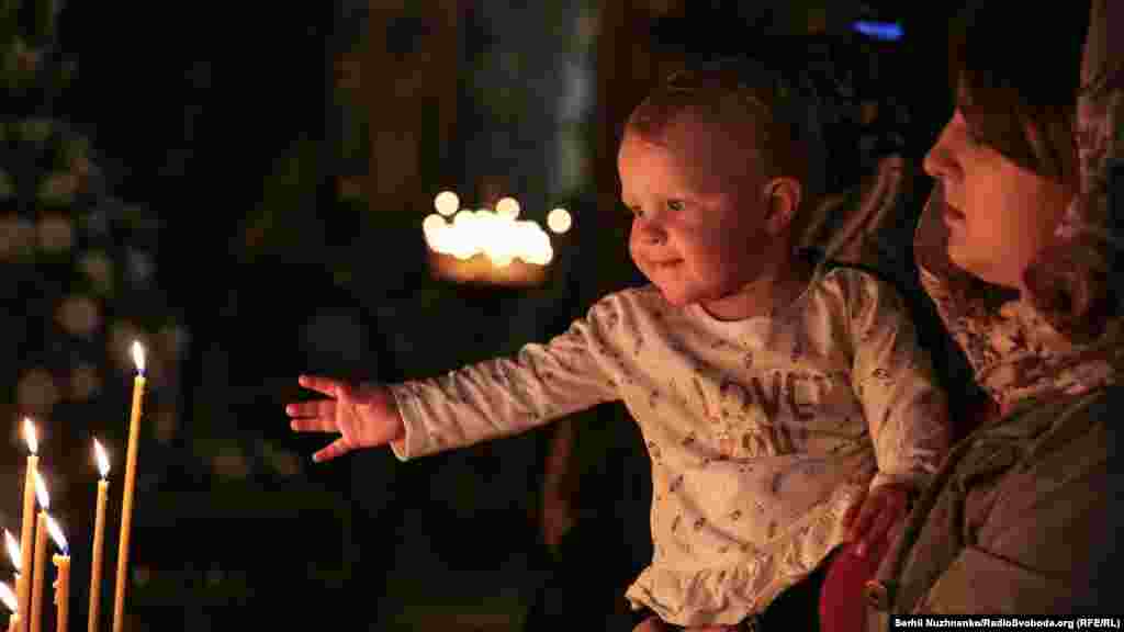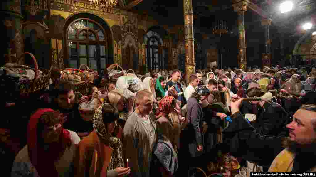 28 квітня в Україні відзначають свято Воскресіння Христисового. Напередодні привезли «благодатний» вогонь із Єрусалима до Києва. На території усієї України пройшли вечірні церковні служби. Фотокореспондент Радіо Свобода разом з вірянами побував у Свято-Михайлівському Золотоверхому соборі (Православна церква України), Києво-Печерській лаврі (Російська православна церква в Україні (УПЦ МП) та у Володимирському соборі, де відбулися урочисті богослужіння, присвячені Великодню.