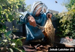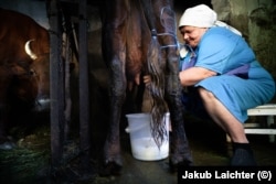 62-річна Тетяна на своєму полі з однією з уцілілих корів. Фото: Якуб Лайхтер (©)
